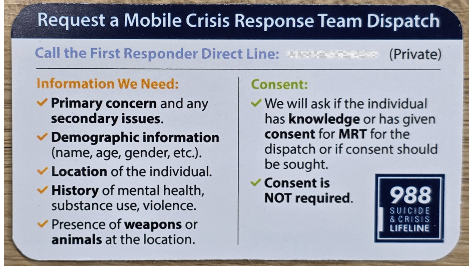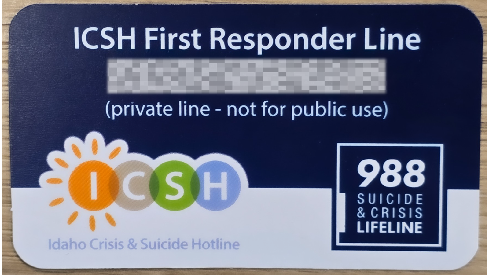 ICSH has a dedicated first responder line that allows law enforcement and EMS to quickly request assistance, including mobile crisis dispatch. First responders who would like wallet cards with this number can complete the request form on this page.